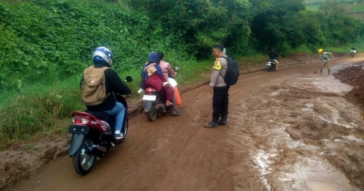 Bhabinkamtibmas Polsek Pacet Polres Cianjur, Aipda Nandar Setiana, melaksanakan kegiatan pengaturan lalu lintas (gatur lalin) serta evakuasi terhadap pengendara yang terjatuh akibat kondisi jalan licin di Jalan Raya Puncak 2, Kampung Cisereuh, Desa Batulawang, Kecamatan Cipanas, Kabupaten Cianjur, Selasa (21/4/2026). Kondisi tersebut disebabkan oleh lumpur yang terbawa aliran air hujan dari area kebun ke badan jalan.